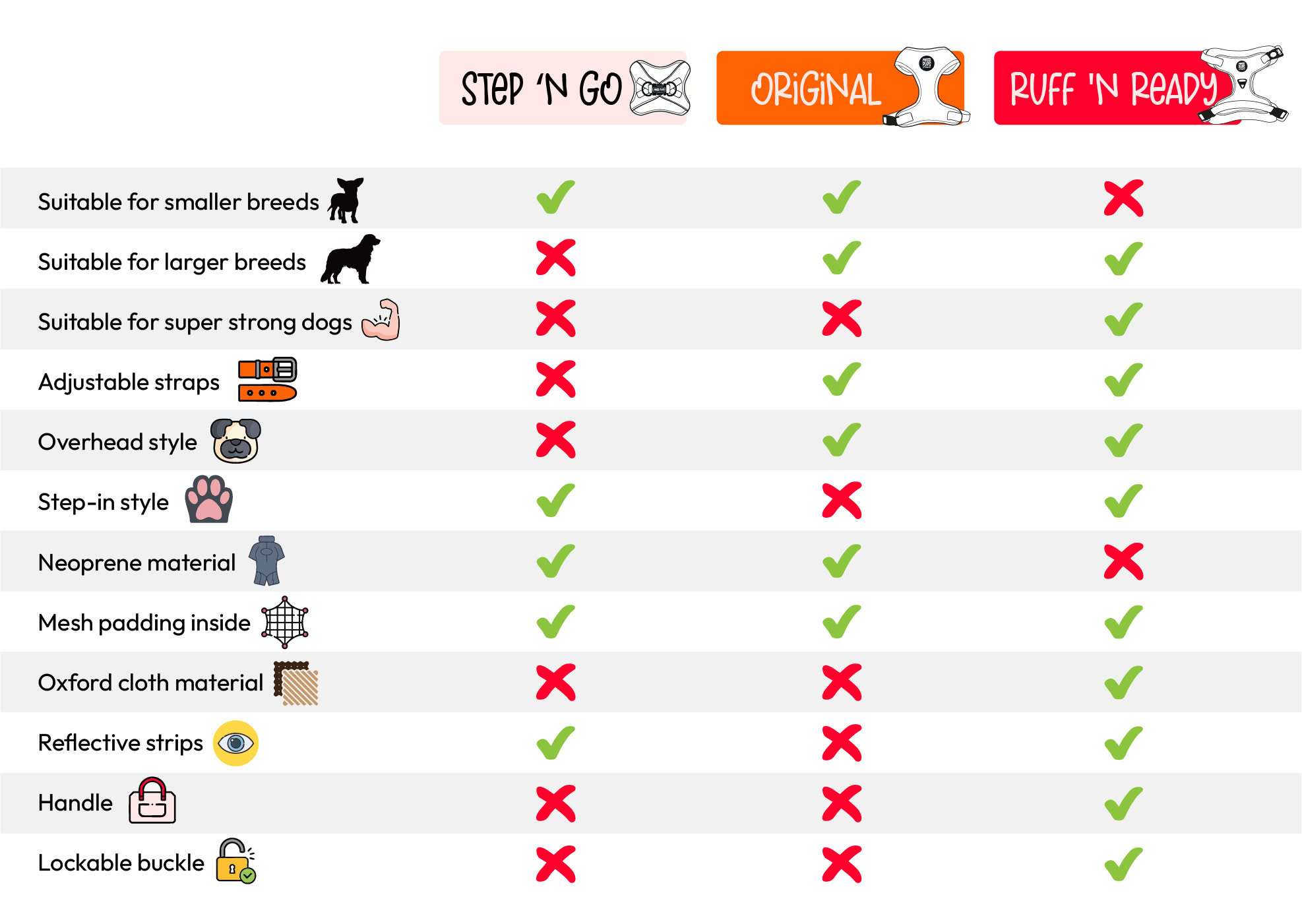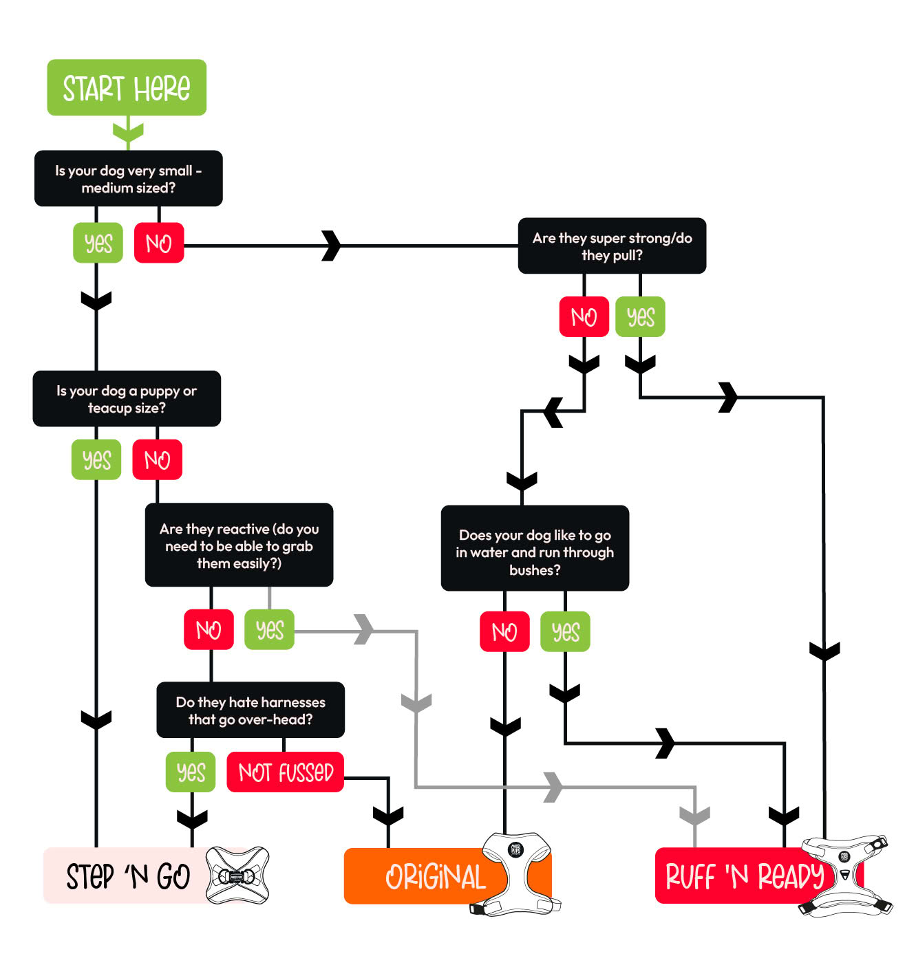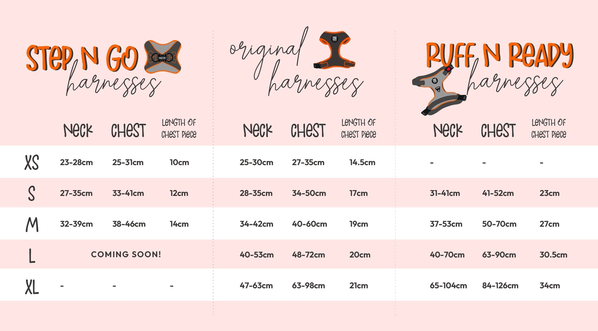 For example our Ruff ‘n Ready harnesses are a great fit for bigger, stronger dogs or those who like to take their humans for a walk rather than the other way round. On the other end of the scale, our Step ‘n Go harness is the perfect solution for smaller dogs, with sizing that runs extra small for the tiniest of adventurers.