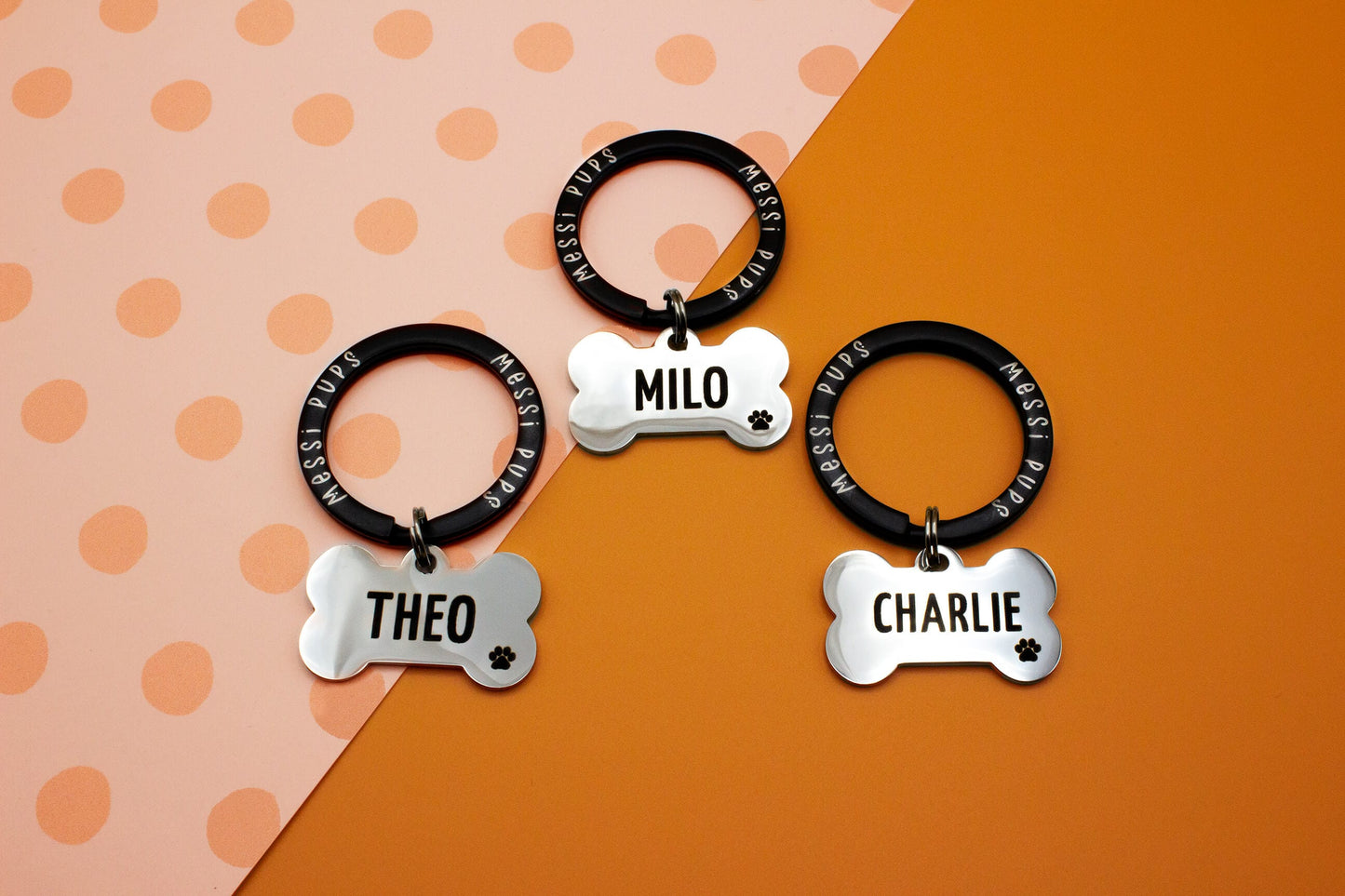 Tags come attached to a small black split ring and either a high quality, heavy duty ‘Messi Pups’ branded split ring, or a 360 swivel lobster clasp. This ensures your tag will face the right way (and not sideways!) and will be totally secure for your rambunctious pup!